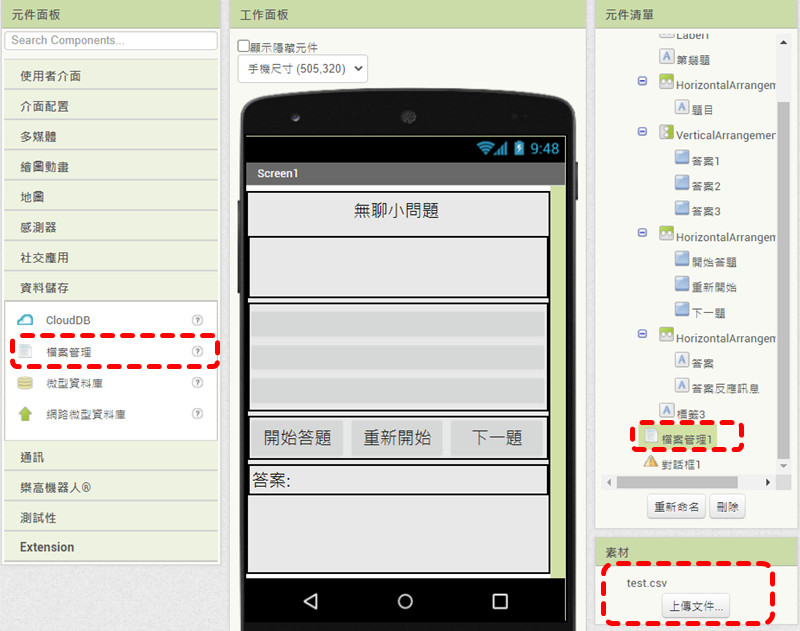 接著上一篇的問答遊戲中,我們是直接在程式設計裡頭建立問題的清單,以及答案的清單來使用。但是這種建立資料的做法,實在是太麻煩了。以後要更新資料還是新增資料都很麻煩,所以這一次我們用檔案管理元件讀取 CSV檔文件來做。