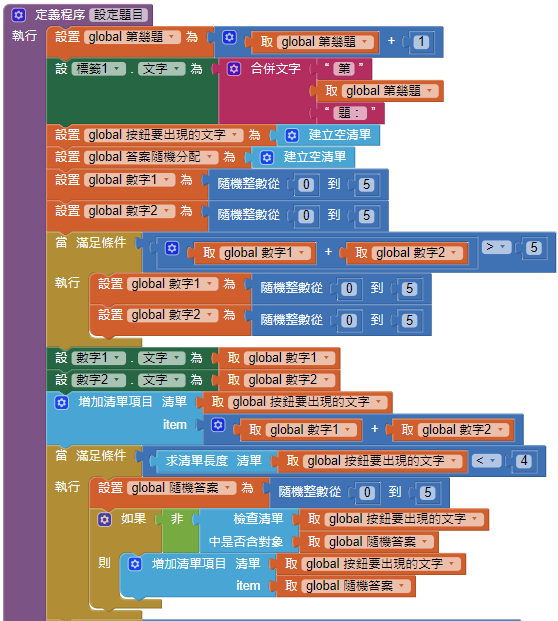 App Inventor學習記錄89-簡單加法,5種等級,隨機題目,隨機按鈕,題目記錄