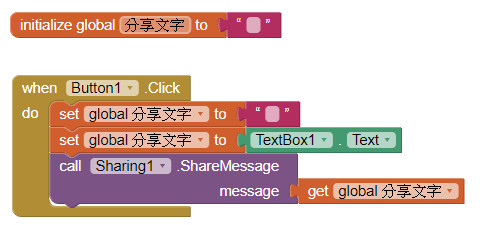 2.把『global分享文字』的內容,設定成『TextBox1.Text』文字輸入框的內容。
