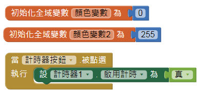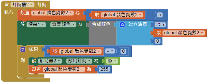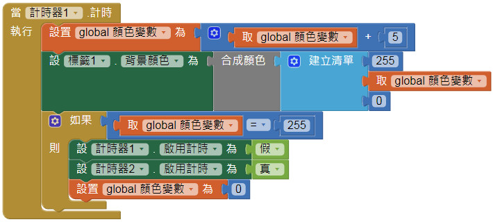 把顏色變數的值,每次加 5。這裡計時器的計器間隔設定的是 50。