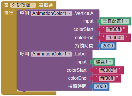 用外掛來做的好處很明顯,就是顏色很好取,只要放開始顏色、結束顏色和時間,其它的都不用管。不用像第一種方法,又要變數、又要計時器,寫起來有點麻煩。