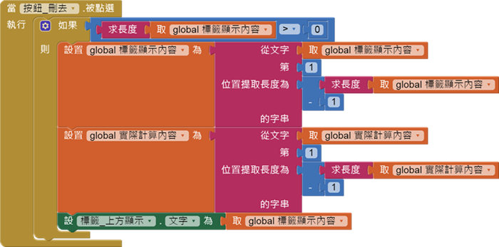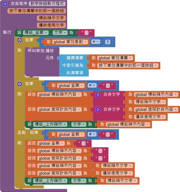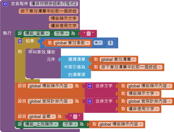 如果答案變數是空白的時候,這代表還沒有按下過等於按鈕,所以讓按下按鈕的文字直接顯示就可以,再用文字方塊的合併文字,把文字組合起來就可以。只是前面有說明,這次用的數字外掛,用的符號和一般常看到的不同,所以會把顯示的內容,和運算的內容分開成兩個。