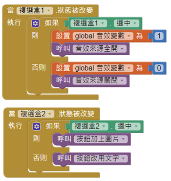如果複選盒被選上的話,就呼叫音效來源全開,按鈕加上圖片程式。