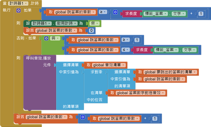 說答案的變數,它的值是 0,當計器時啟動的時候,這個值會每次計時都加 1,然後呼叫對應的音效元件來播放聲音,也就是說一次播放一個音效,一直到唸完答案為止。