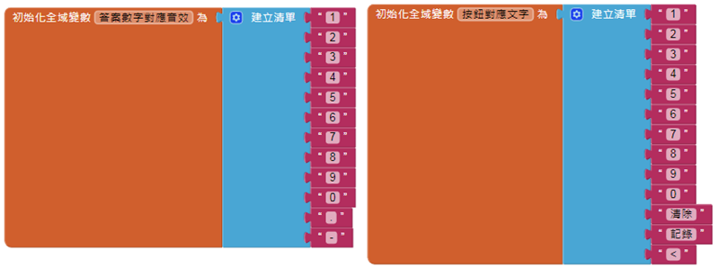 要說出的答案的清單,這個變數的預設值是一個空清單,當按下等於按鈕之後,就會答案這個變數的值逐一加入這一個清單中。舉例來說,如果答案的值是 5201314的話,那麼要說出的答案的清單的值就會是 (5,2,0,1,3,1,4)。