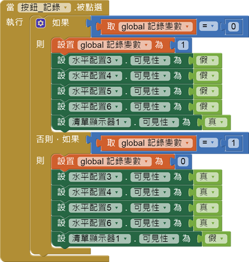 這個跟按下設定按鈕的作法是同樣的,都是變化一下記錄變數的值,同樣切換相關元件的顯示性。這裡主要是要把清單顯示器的可見性顯示出來。像下圖這樣。