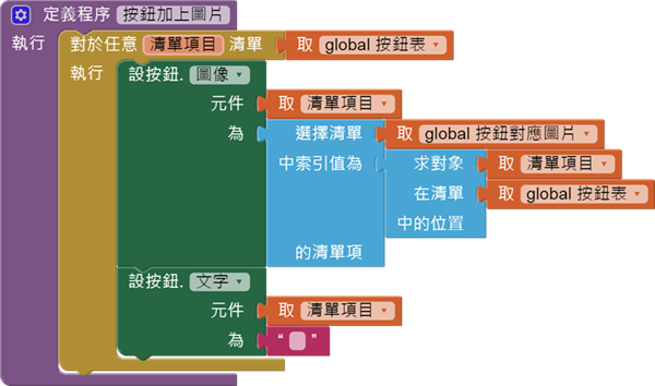 這個程式執行的時候,把按鈕表這個清單中所有的按鈕的圖片,都設定成按鈕對應圖片清單中的圖片,再把所有按鈕的文字設定成空白。