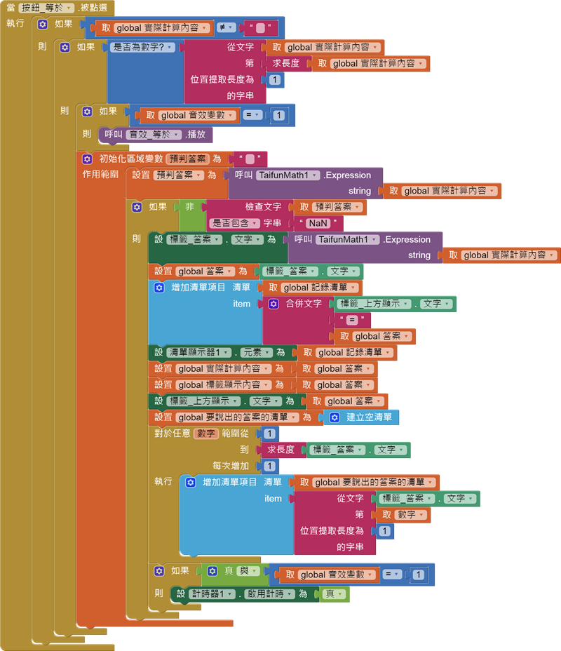 這一次拋棄了在App Inventor學習記錄96-簡單的笨蛋柔語音計算機中的做法,重新找了一個外掛來處理數學算式的問題,照道理講原本的程式會再簡單些,但在我老婆的測試下,找出了不少問題,最後都有把它處理完成。所以這一版就已經可以正常的使用。