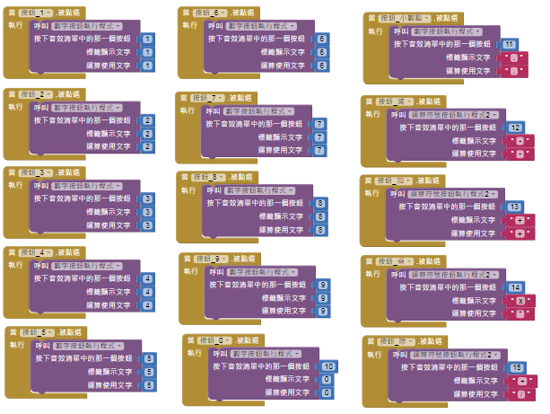 這幾個按鈕的做法都相同。數字相關的按鈕,就呼叫數字按鈕執行程式,填入相關的參數值。