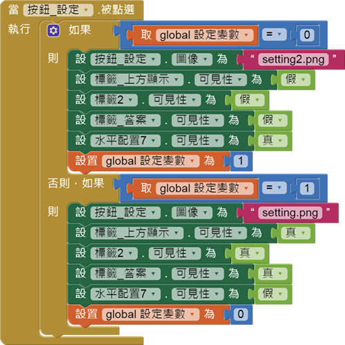 當設定按鈕被按下的時候,變更設定變數的值,同時切換相關元件的可見件,來顯示相關的元件。