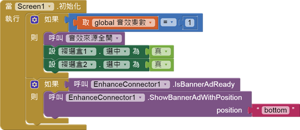 當螢幕初始化的時候,如果音效變數的值等於 1,呼叫音效來源全開這個小程式。