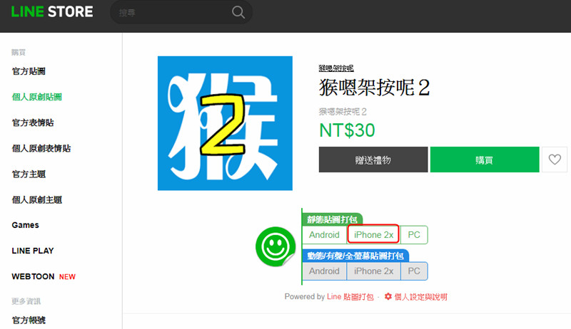 以我自己做的猴嗯架按呢2的貼圖為例,我們可以看到在靜態貼圖打包的下面,有三個項目可以下載,分別是Android iPhone2x以及PC,這三個下載的圖片都是一樣的,只是圖片的大小有分別。