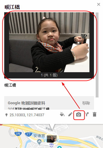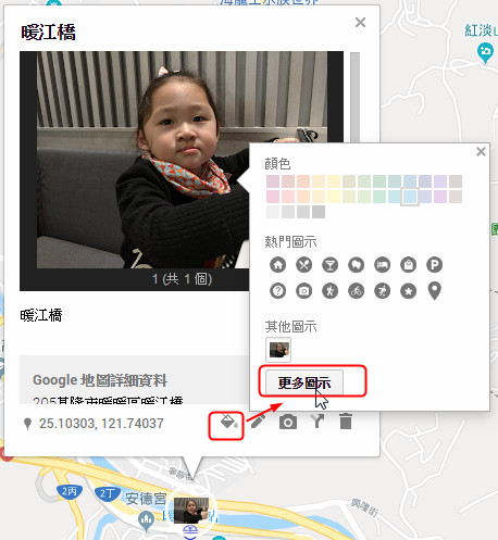 同樣先拿自己的地圖來做演示,請見猴嗯架按呢吃喝玩樂地圖,這個地圖上大家可以看到很多玩和吃的圖示,這個就是自訂的圖示,點一下就會看到我替這個景點加上的圖片和文字說明,參考一下下面這裡照片。