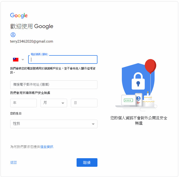 接下來我們要填的是電話號碼、生日和姓別。