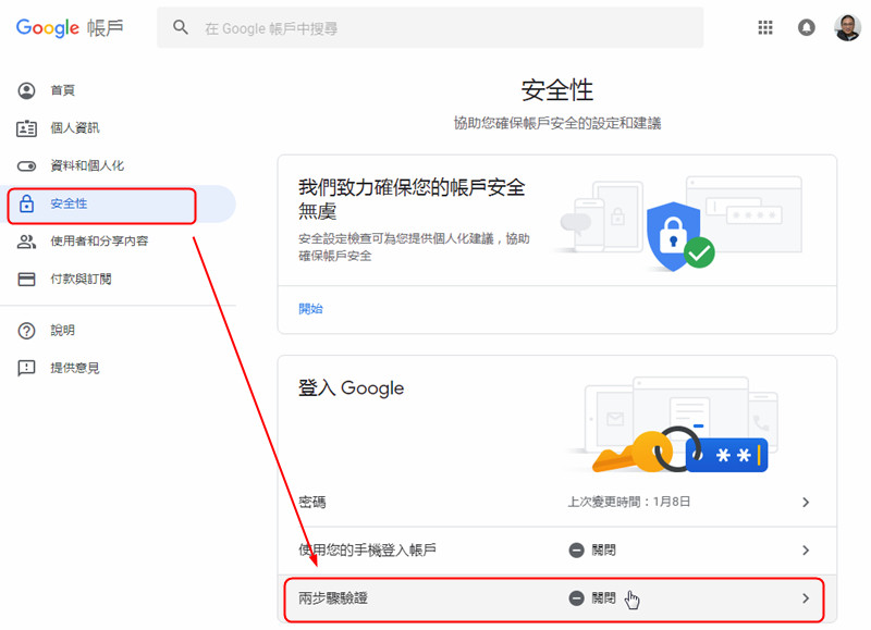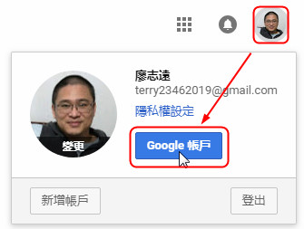 我們登入google帳號之後,點一下右上角的人頭,再點google帳戶。