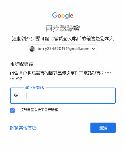 接下來我們重新登入帳號,在輸入密碼之後,就會多一道要輸入驗証碼的步驟。