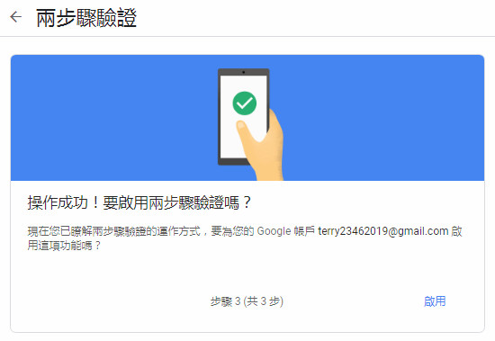 接著啟用兩步驟驗証,如果你的電話號碼沒有經過驗証的話,就會多出一個驗証手機號碼的步驟。google會寄簡訊給你,然後再輸入確認碼就可以。這裡我已經驗証過電話碼認,就直接按下啟用就可以。