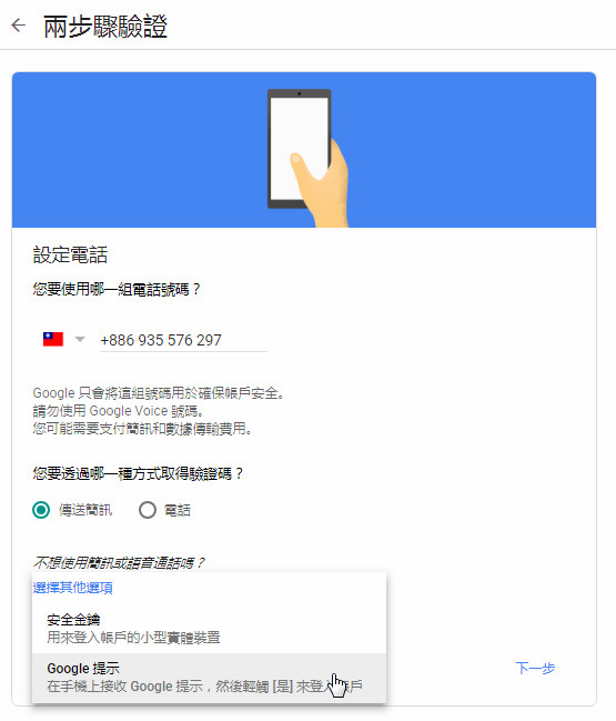 也可以替兩步驟驗証再加上一個備用選項。我選擇的是備用電話。