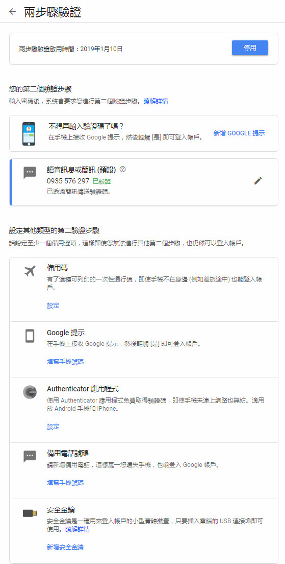 接著啟用兩步驟驗証,如果你的電話號碼沒有經過驗証的話,就會多出一個驗証手機號碼的步驟。google會寄簡訊給你,然後再輸入確認碼就可以。這裡我已經驗証過電話碼認,就直接按下啟用就可以。