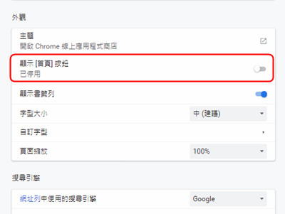 現在新安裝的chrome,都會把首頁這個按鈕給藏起來。這個按鈕還是挺有用的,可以按一下就回到我們指定頁面。我們把這個按鈕給垂新開啟出來。