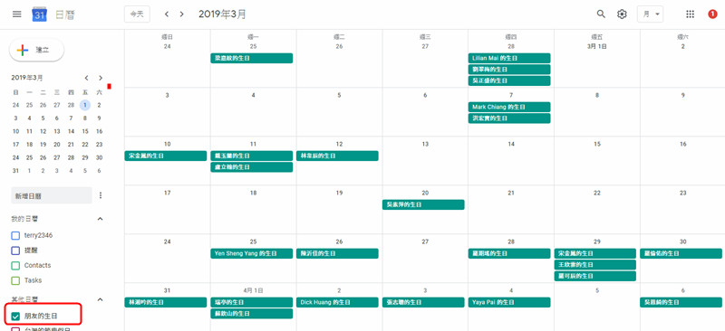 像這樣。由於是新增一個日曆的關係,所以我們可以從左手邊的朋友的生日這個日曆來調整是不是要顯示這一個日曆。