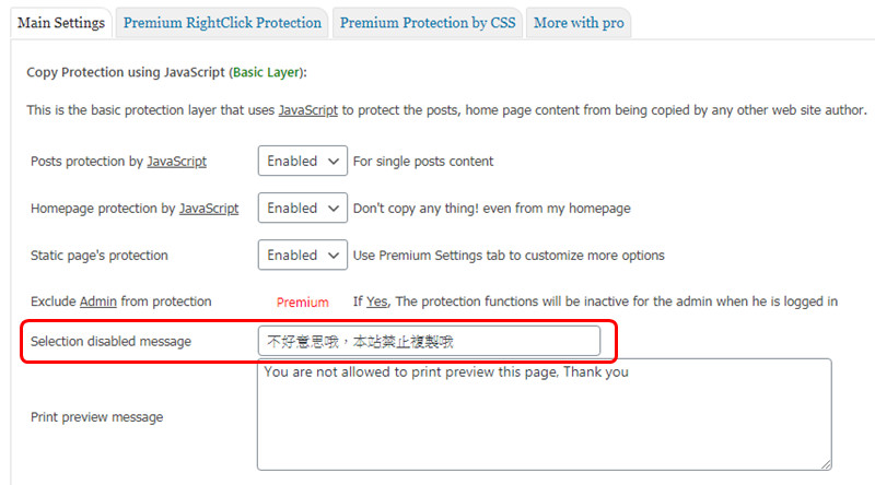 安裝這個外掛並啟用之後,基本上是不需要額外設定。一旦啟用,網站就會自動的把右鍵給鎖起來。