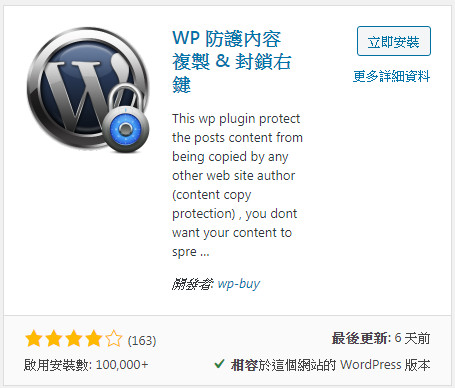 我們直接用 WP Content Copy Protection來搜尋外掛。我們會找到這一個外掛。目前它的使用數已經超過十萬次,而且最棒的是它目前還是一直維持更新的狀態。